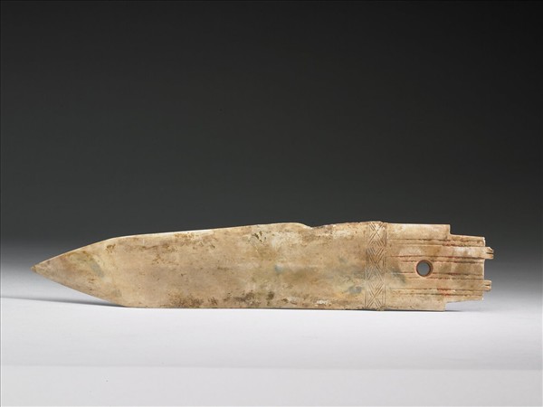 玉質,大部分沁成淺赭色及白色。直援,尖形鋒,雙面刃,內援不分,交接處刻一圈菱格紋,內緣不齊整,其上鑽有一孔和四對陰線。