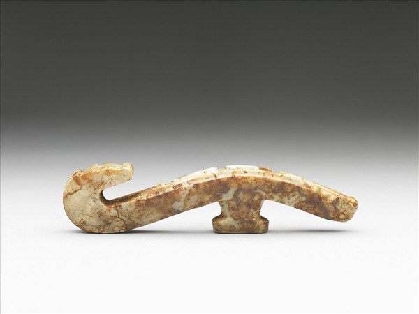 玉質,表面有附著物,大部分呈赭色。細長條有弧度,一端向上內彎為鉤,兩端皆作龍首形,背後中央突起一方柱,用來固著於革帶。正面浮雕三組兩塊長條。
