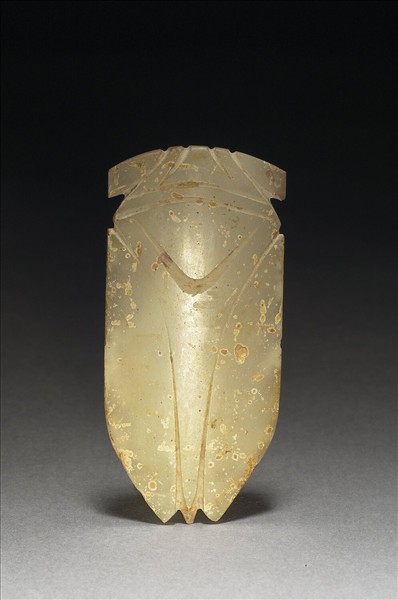 玉質,表面有許多小凹洞。作蟬形,單面陰刻淺紋,線條簡單。