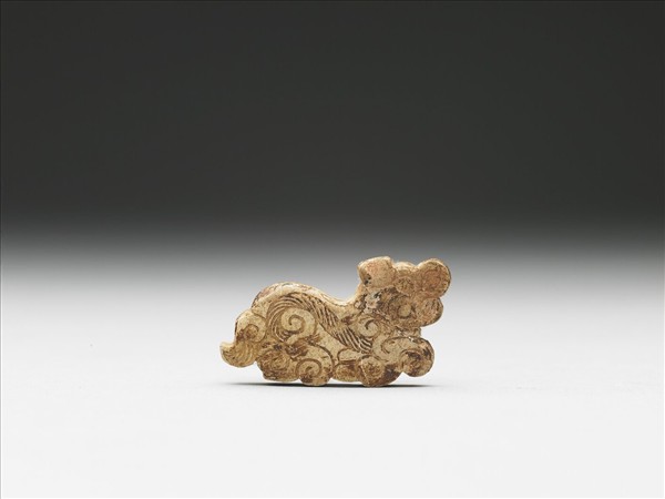 玉深沁呈乳黃色,有赭斑。動物作蹲踞形狀,面部紋飾模糊,身軀以雲紋和斜線紋表現,小巧可愛。有一孔貫穿身軀,用來繫繩佩戴。