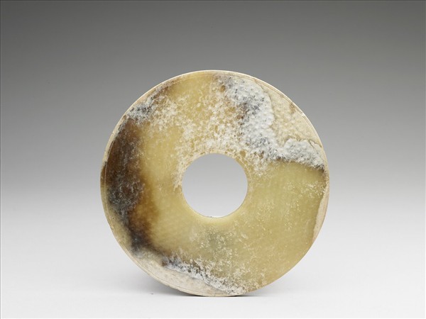 玉質,有裂璺,大部分沁成白色,局部帶赭斑。器薄,兩面均飾用三種不同方向之平行線交錯而成的蒲紋,內外緣有弦紋一圈。