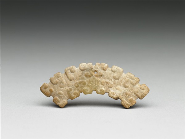 玉質,有濃淡不一的赭斑,局部呈白色。弧度淺,四周有凹凸齒棱,面部凸雕因線刻雲紋,間有斜線紋,以為龍紋。上緣中央鑽有一孔。