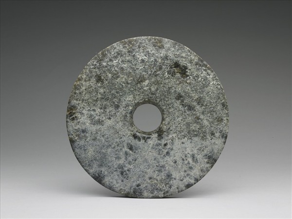 斑雜結構明顯的墨綠夾褐色玉,分佈白色蛛網般的沁斑。璧面較大,雖非正圓,尚稱規整,厚薄尚勻,器表拋光甚平整,僅一面留有一片淺凹陷。孔由二面對鑽,兩面器表的孔徑均為4.7公分,鑽鑿時管狀工具耗損快,致使在孔壁中段結合處,孔徑只有4.12公分。鑽鑿結合處留有崩截面,孔壁雖經磨光,但還留有淺旋痕。厚約1.2-1.3公分的圓周磨作內凹狀,磨痕與圓周同向。