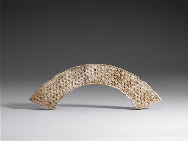 玉質,局部有墨斑、赭斑,表面有附著物。弧度略平,上下緣不平行,兩端微寬。兩面滿飾穀紋,兩端雖無明顯的龍頭,但淺的方形凹凸齒棱,即龍紋之角、鼻。中央偏上緣有一孔。