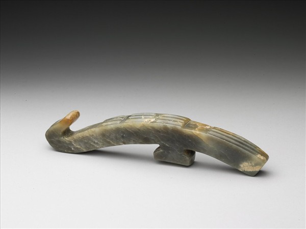 玉質,有璺,局部受沁白化。鉤身呈長條弧形,鉤首上彎,腹下有鈕。主要用作鉤繫束腰的腰帶頭。