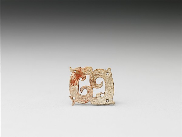 石質,表面有附著物。鏤空兩條龍,雙龍捲曲相連成近方形,四頂角作突起小角,頂角內各鑽一孔。單面有紋飾,但已模糊不清楚。