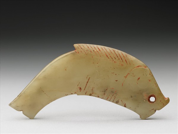 玉質,表面附著硃砂。作一魚,首尾皆向下彎,似呈月牙形。圓眼,近魚嘴處鑽一小孔用以穿繩繫掛。紋飾簡單而渾樸古趣。