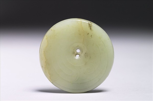 玉質泛黃斑,有裂痕。圓形,全器琢一隻身軀盤繞的龍。圓中心鑽兩孔。