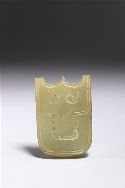 玉質,鱗片形玉飾,單面雙陰線刻紋,由上而下:有兩個鉤形紋、一倒「介」字形紋、一「U」形紋。背面有四個未穿透的圓凹。正面有白色摩擦的痕跡。這一件應可與其他飾件串聯成一件大玉飾。