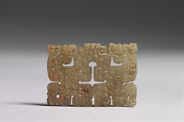 玉質,表面沾有硃砂。方形,鏤雕一對龍鳳合體,沿輪廓有一圈弦紋,其內浮雕雲紋,間有斜線紋。四個角各鑽有一孔。