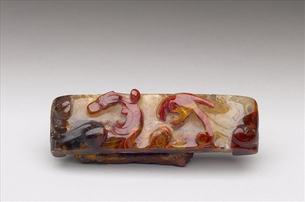 赭、黃色瑪瑙。面雕龍紋,由於瑪瑙光亮的特性,顯得栩栩如生。下有一方形穿帶孔。