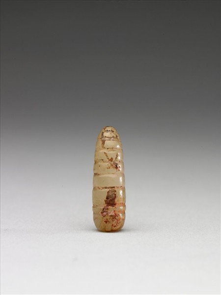 玉質,表面有赭色附著物。作蠶形,一端較細,有一平面,平面上有象鼻穿。