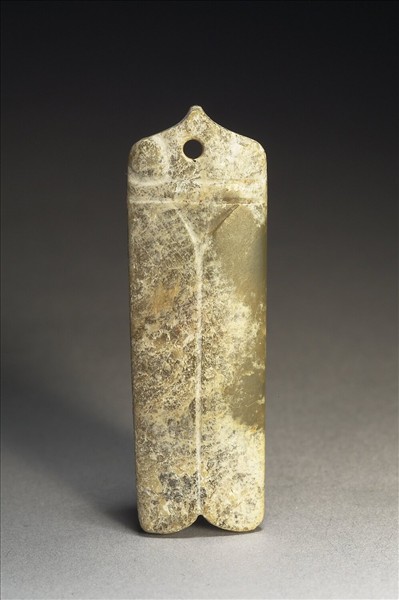玉質,有許多白斑。長條形,頂作一「介」字結構,線條簡單。「介」字結構下鑽有一孔,應是用穿繩佩帶用。