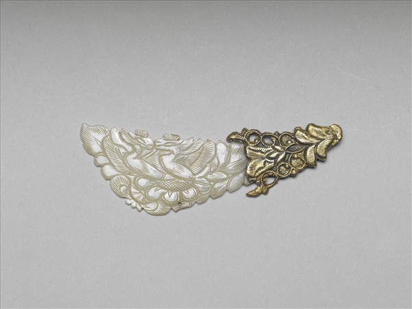 玉質,色青白,有白斑。呈三角形,雙面淺浮雕朵花與葉,其間停有小鳥,鳥翅與花葉交錯。一角鑲嵌鏤雕枝葉果實的金屬飾件。