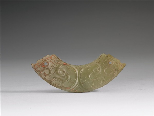 器呈圓弧形,兩端有小圓穿用以穿繫絲繩佩掛。兩面花紋相同,雕兩隻虎,虎頭相背,虎面向外,張口瞋目,神情勇猛。