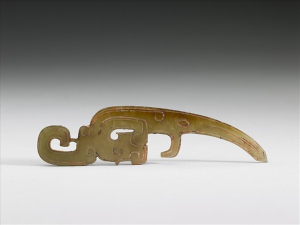 玉質,局部泛赭色。作龍形,頸部內彎,頭上一個大角,身作淺弧形。紋飾簡單,全器無穿孔。