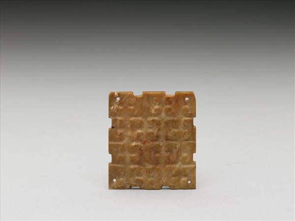 玉質,帶白斑和濃淡不一的赭斑,表面有附著物。長方形玉片,四周有凹凸齒棱,單面淺浮雕雲紋,間有斜線紋,組合而成龍紋。四角各鑽一孔。