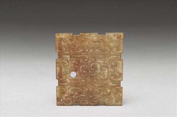 長方形玉片,表面深沁成白色。四周有凹凸齒棱,單面淺浮雕雲紋,間有斜線紋,組合而成龍紋。四角各鑽一孔,另有一大孔。
