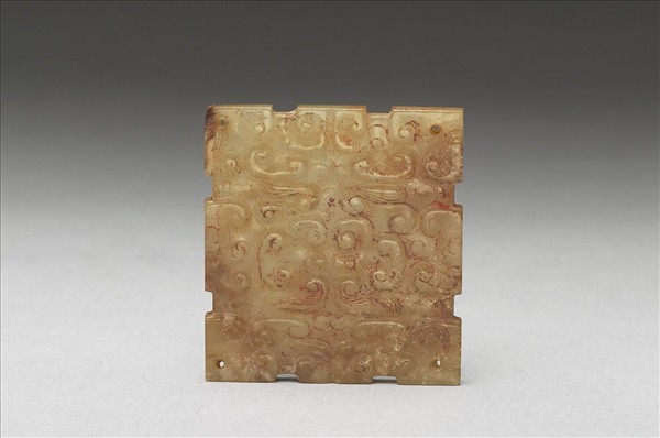 長方形玉片,帶白斑。四周有凹凸齒棱,單面淺浮雕雲紋,間有斜線紋,組合而成龍紋。四角各鑽一孔,背面有兩道鋸痕。