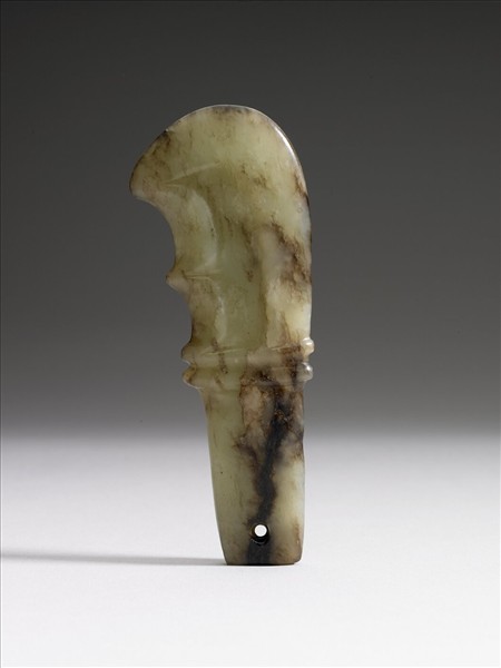 鷹杖,流行於遼河流域紅山文化晚期。有的玉鷹杖鳥頭部分雕琢寫實,有的則簡化,僅以彎勾象徵鷹鳥壯碩的勾喙。此件為玉鷹杖的上半截,紋飾簡化,下端原插嵌於長杆上,是招降鷹鳥神靈的法器。