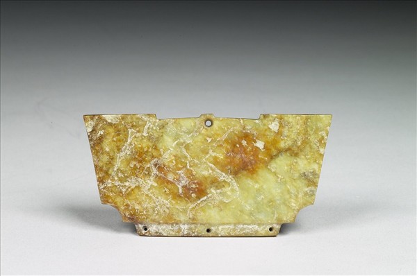 約二、三十年前考古學家從良渚文化遺址裡發掘到類似此件造形的玉器時,並不知道它的功能。曾懷疑它們是神偶的玉冠而稱作「冠狀器」。後來在周家浜發掘所得的冠狀器下方還連接著有機質製作的梳齒,才知道冠狀器就是梳背。最初期的冠狀器的造形,頗像一雙「神玄之鳥」夾著象徵「上通天界」的「尖錐形符號」。河姆渡文化陶盆上刻繪神祖所戴的「『介』 字形冠」應是冠狀器造形的源頭。具通天涵義的冠狀器藉梳齒固定於宗教人物頭頂,象徵戴者具有通天法力。此件冠狀器上方中央的「介」字形已較為式樣化,但是器身兩側的下方,卻發展出小凹弧,下緣的扁榫上還有三個兩面對鑽的小孔。