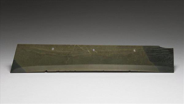 深草綠色玉質,兩端出現更深的墨綠色帶藻絲包裹體沉積結構,全器清楚地可見流動帶狀的層層沉積結構。不對稱長刀形,凹弧刃,刃弧起迄端溫厚,刃線清楚,沿背緣鑽三孔,單面鑽,孔壁垂直,窄端背緣有一刨凹弧。