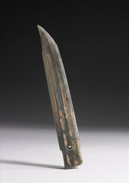 墨灰半透明玉,有黑色芝麻點,沾有硃砂。援末端較窄,中間有稜脊,前鋒尖銳帶彎,雙面刃,內作梯形,援與內交接處鑽有一孔。