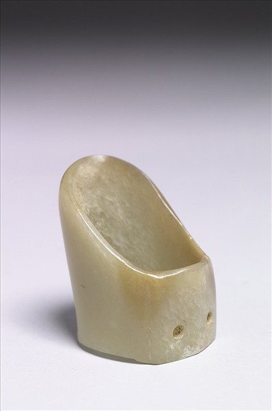 玉質,泛白色絲紋及赭斑。橢圓形筒狀,一端平齊,一端斜口,口上圓下方,底端正面鑽兩孔,背面琢了兩道橫溝。玉韘是一種指上的飾物。