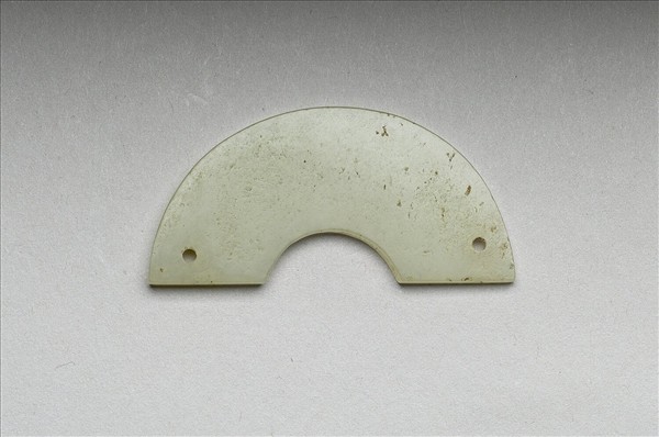 玉質,器表有小凹槽。佩飾,半璧形,兩端偏外緣處有兩孔。全器無紋。購玉000303-000305為一組。