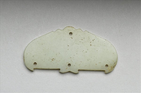 玉質,器表有小凹槽。佩飾,類三角形玉片,三個角均作圓弧形,上緣作對稱的波浪形,中央有一孔,下緣兩端雕向勢之小鉤,中間雕一魚尾形狀。全器無紋。購玉000303-000305為一組。