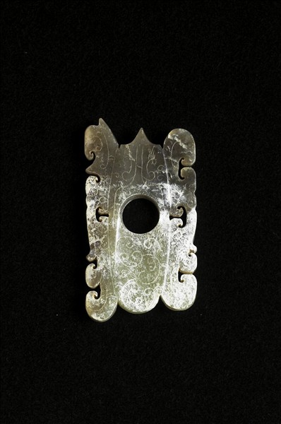 墨綠色玉,有明顯的白斑。此器長條形,中央有一圓孔,兩側鏤空勾雲紋,左右不對稱,中間琢雲紋,上端有一尖角。由戴在手指上的韘的形狀而來,作成幾乎板狀體。