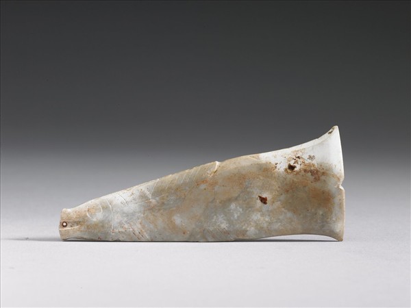 灰白色玉石帶赭斑。琢作魚形,首窄尾寬,上下琢鰭,鰓及眼睛的線條簡單,富古樸之趣,口上有一穿孔。