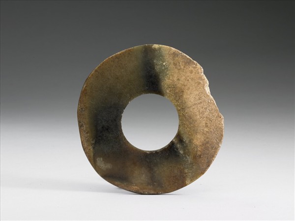 墨綠色玉,有白斑和濃淡不一的褐色雜斑。非正圓,器外緣有缺,一面有切割截口。表面光素。