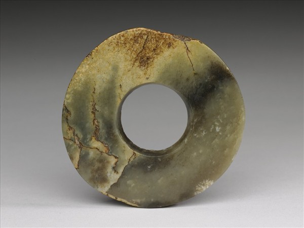 玉質,有墨褐色薄絲紋,一端蝕化成褐白色,半透明。全器不甚圓整;中孔偏一側,單面桯鑽,孔壁斜而有旋轉紋,底口留有毛邊,厚重。表面光素,拋光。