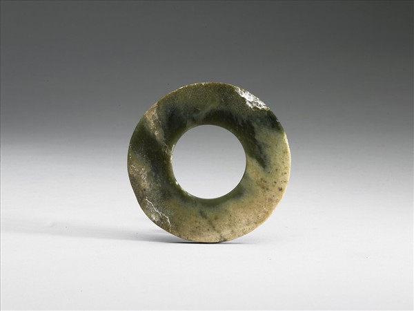 玉質,有灰白色斑。中孔較大,器外緣有缺。表面光素。