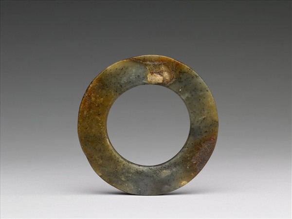 玉質半透明,有濃淡不一的赭色斑、黑色芝麻點斑。中孔大。表面光素。