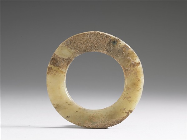 玉質,有濃淡不一的墨色雜斑,表面並有附著物。中孔大。表面光素。