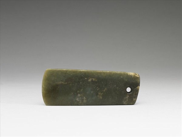 青色略帶褐黃玉,一面有較深的褐色。全器近長方形,淺圓弧刃。接柄端有一鑽孔。