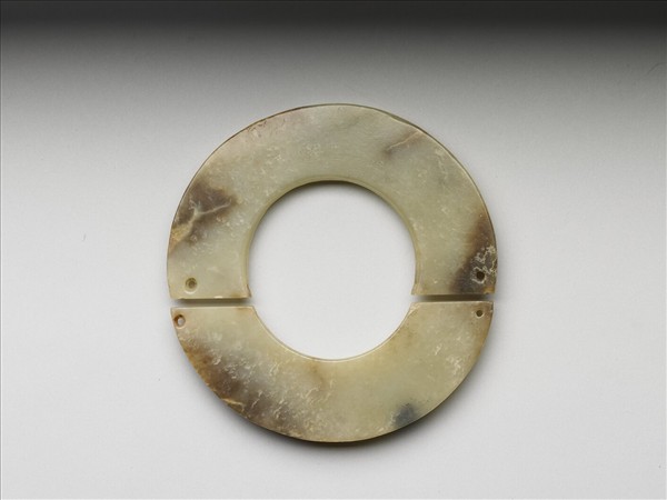 玉質,灰脂色,有褐色、灰黑色斑,半透明。全器是由二片不等的半環形璜所組成,每片璜兩端各鑽有三個穿(其中一片的一端只二個穿),一個在肉面上,兩個在切壁上,肉面上的穿孔有磨損痕跡;中孔和外緣磨飾圓滑。表面光素溫潤。