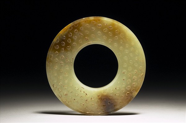 玉質,帶濃淡不一的赭斑,表面有附著物。內緣與外緣各有一圈弦紋,兩弦之間琢滿榖紋,此璧兩面皆有紋飾。