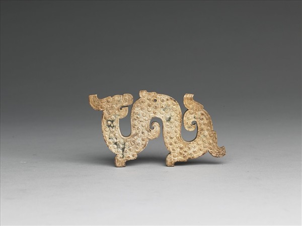 玉質,沁作灰白泛黃色。龍彎曲呈S形,捲鼻,頂上有角。全器輪廓琢有陰線,其間遍布凸起雲紋。上部中央鑽有一孔。購玉000360-000361成對。