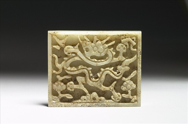 玉質。器作長方形,正面浮雕一龍盤據其中,周圍飾花鳥、罄及靈芝紋。背面四對象鼻穿。此板和另外十九件(購玉363-382)組成一套玉帶。