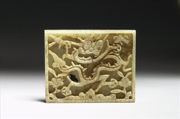長方形玉板,正面浮雕一龍盤據其中,周圍飾花鳥、罄及靈芝紋。背面四對象鼻穿。此板和另外十九件(購玉363-382)組成一套玉帶。