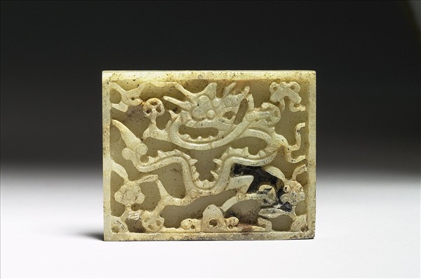 長方形玉板,正面浮雕一龍盤據其中,周圍飾花鳥、罄及靈芝紋。背面四對象鼻穿。此板和另外十九件(購玉363-382)組成一套玉帶。