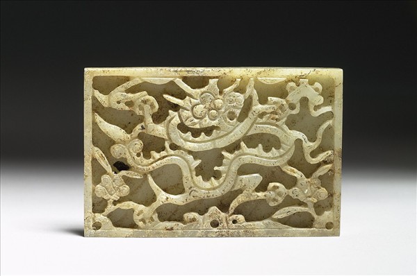 長方形玉板,正面浮雕一龍盤據其中,周圍飾花鳥、罄及靈芝紋。背面四對象鼻穿。此板和另外十九件(購玉363-382)組成一套玉帶。