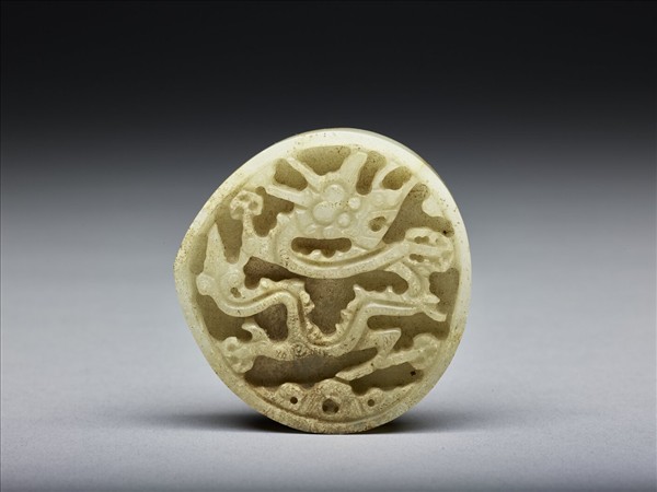 桃形玉板,正面凹雕一桃形,內浮雕龍紋,盤據其中。背面三對象鼻穿。此板和另外十九件(購玉363-382)組成一套玉帶。