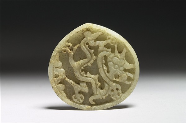 桃形玉板,正面凹雕一桃形,凸雕一條龍盤據其中。背面三對象鼻穿。此板和另外十九件(購玉363-382)組成一套玉帶。