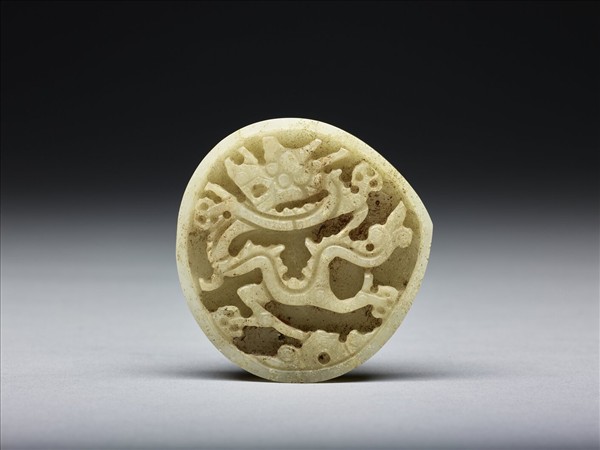 桃形玉板,正面凹雕一桃形,凸雕一條龍盤據其中。背面三對象鼻穿。此板和另外十九件(購玉363-382)組成一套玉帶。