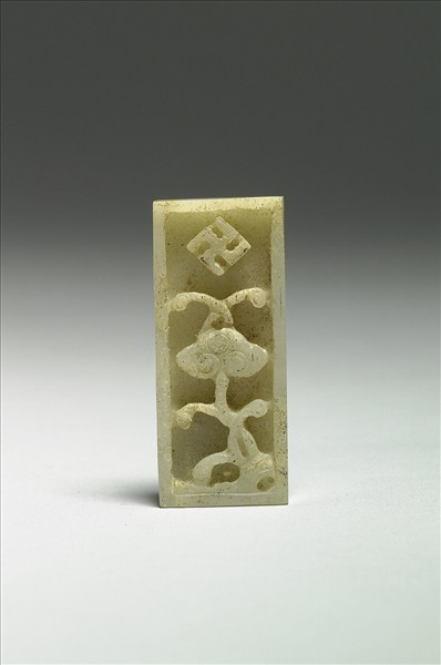 長方形玉板,正面凹雕一長方形,裡面凸雕具吉祥寓意的靈芝和卍字。背面兩對象鼻穿。此板和另外十九件(購玉363-382)組成一套玉帶。