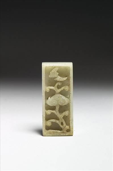 長方形玉板,正面雕一長方形,內浮雕具吉祥寓意的靈芝和蝙蝠。背面兩對象鼻穿。此板和另外十九件(購玉363-382)組成一套玉帶。